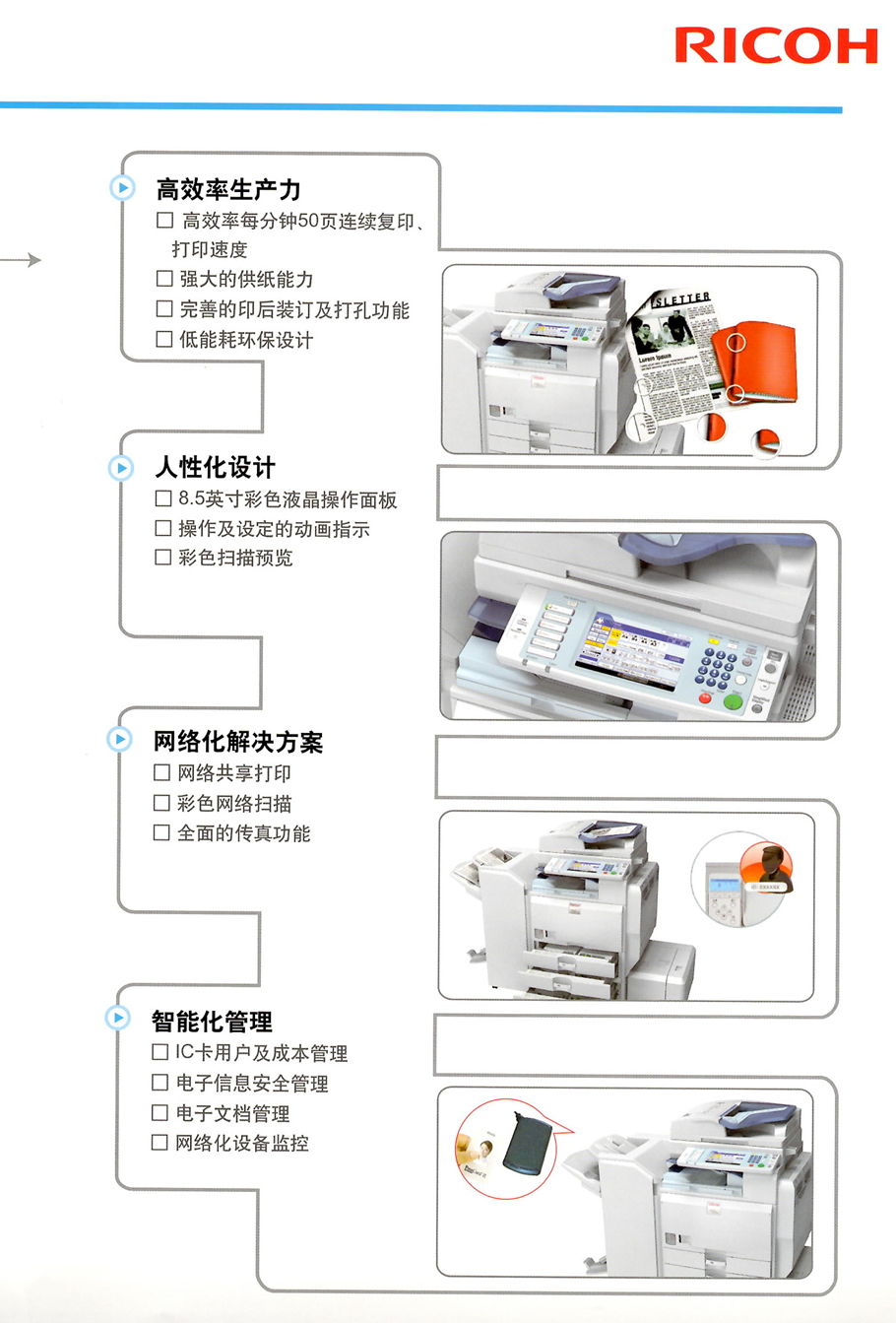 描述:打印机租赁9成新样机,复印/网络打印/网络彩色扫描适合月用量1万-3万张用户。理光Aficio MP 5001拥有高效的文件处理能力和优异的图像品质,集合复印、网络打印、网络扫描、传真等多种功能于一体。同时,充分考虑了数字化办公对文件处理的需求, 提供便捷友好的用户界面,智能化的设备维护及管理方式,行业领先的信息安全等功能,为您提高文档处理效率提供良好对策。 Aficio MP 5001作为面向中型工作组或办公室用户的数码办公系统,能让您享有更优异的文档解决方案,全面提升您的工作流程。