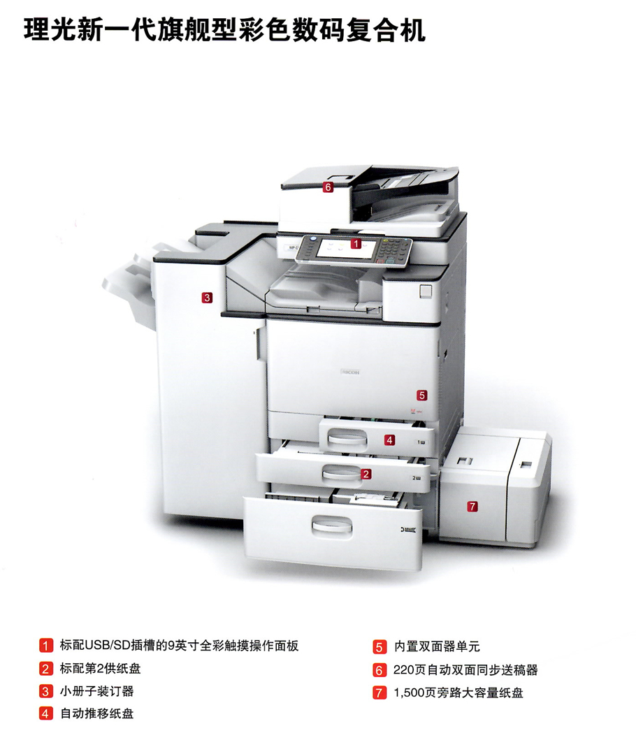 描述:(理光办公型高端彩色一体机性能卓越!办公高效!) 打印分辨率提升到1200x1200dpi/2bit 最大可支持SRA3(320x450mm)尺寸纸张输出双面纸张重量可达256g/m2 标配信封供纸盘包括内置装订器在内的更多全新选购件送稿器供纸能力进一步改善(ARDF扩展到100页,SPDF扩展到220页)海报打印功能可实现无书钉小册子折叠。